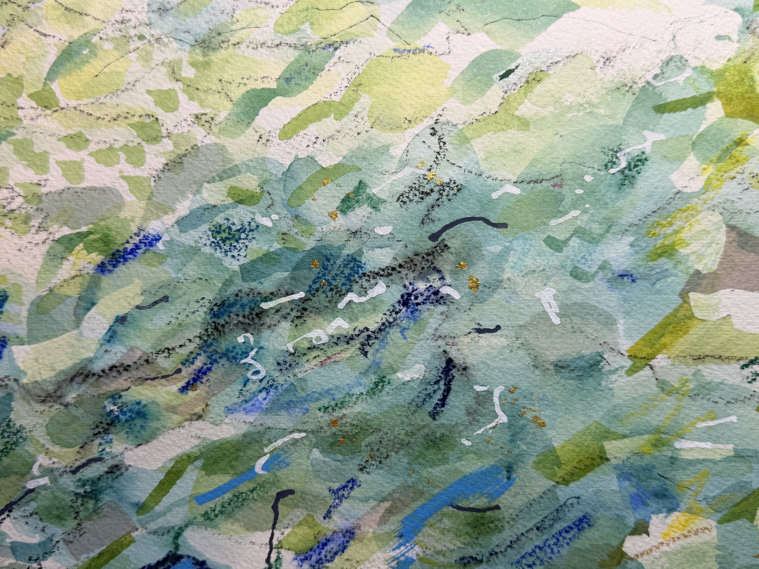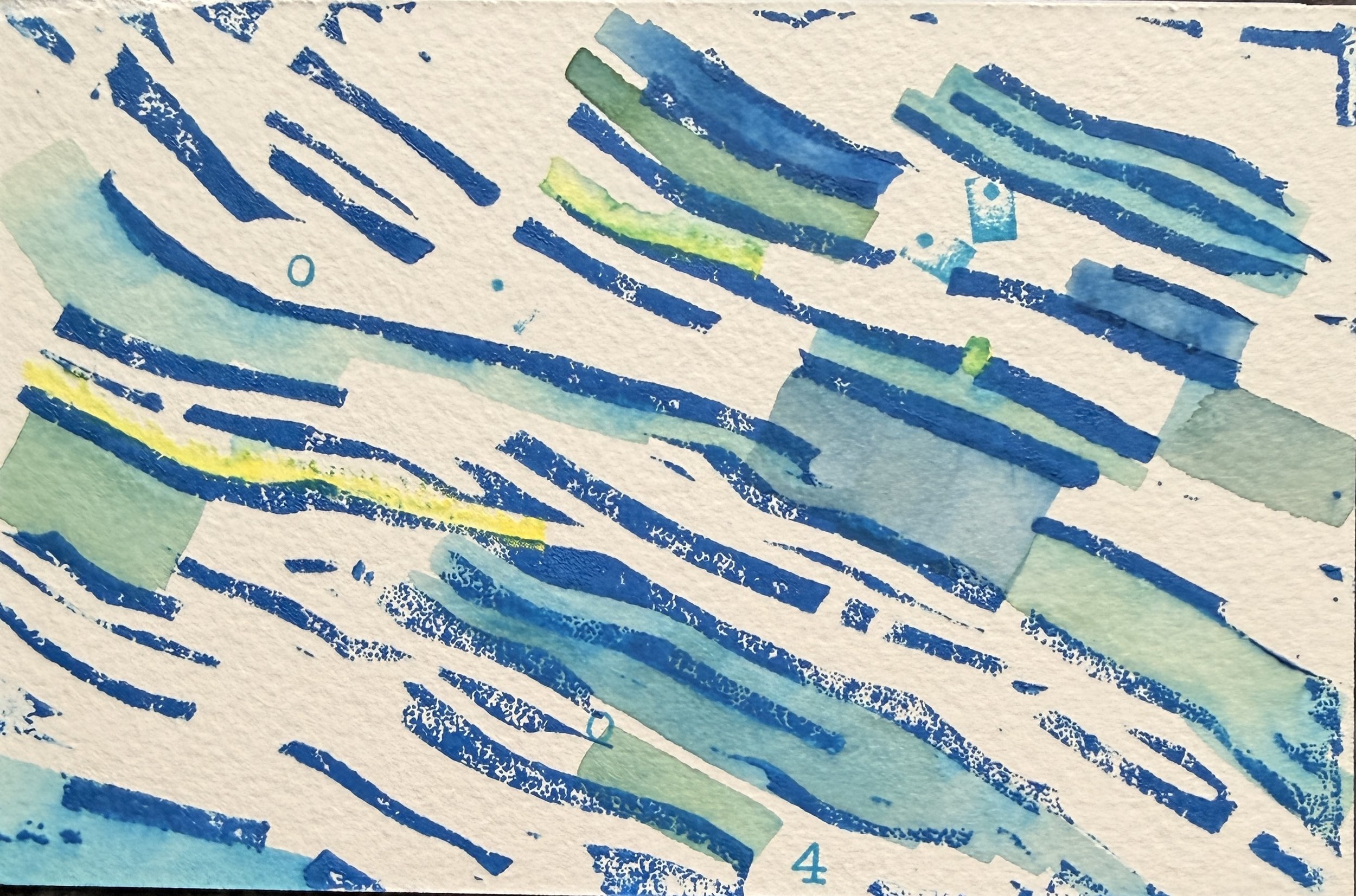 One in a series of six hand coloured and embellished block prints. Part of a developing serial exploration of the “impossibility of painting water”